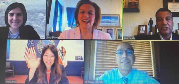 The Santa Clarita Valley Chamber of Commerce hosted a virtual roundtable with (left-to-right) Office of the Small Business Advocate Director Isabel Guzman, Chamber President and Chief Strategist John Musella, Treasurer Ma, Santa Clarita Assemblywoman Christy Smith, and California Lieutenant Governor Eleni Kounalakis. The roundtable focused on how to help California rebuild in the wake of COVID-19.